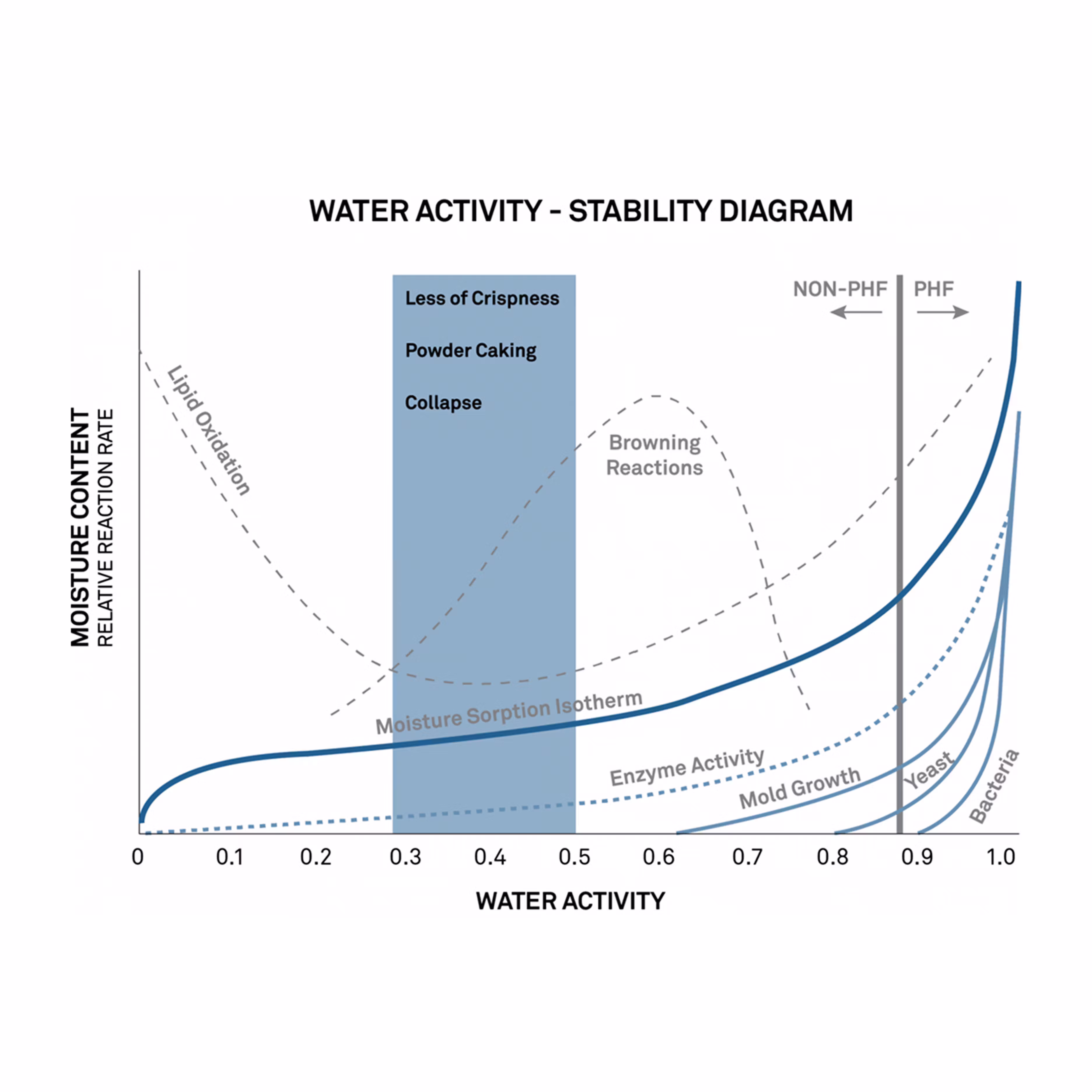 Processes involving water are influenced by water activity, not moisture content. This encompasses phenomena such as moisture migration, chemical degradation, enzymatic and browning reactions, oxidation, and of course, microbial growth.