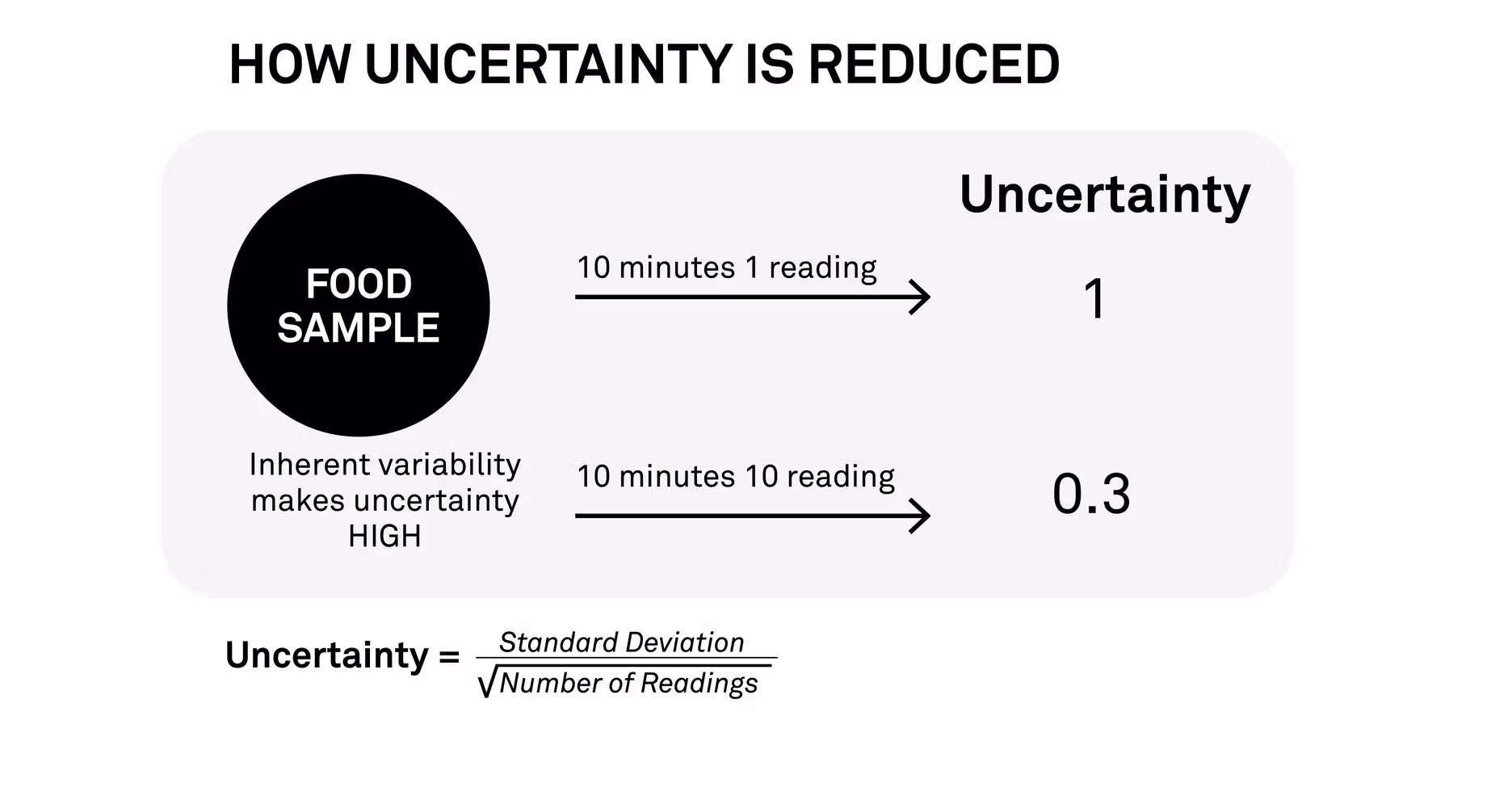 With this in mind, inherent variability contributes more to uncertainty than accuracy. Therefore, the best way to reduce uncertainty in water activity readings is to do more readings. For example, it is significantly more effective in reducing uncertainty to take ten one-minute readings instead of one 10-minute reading.