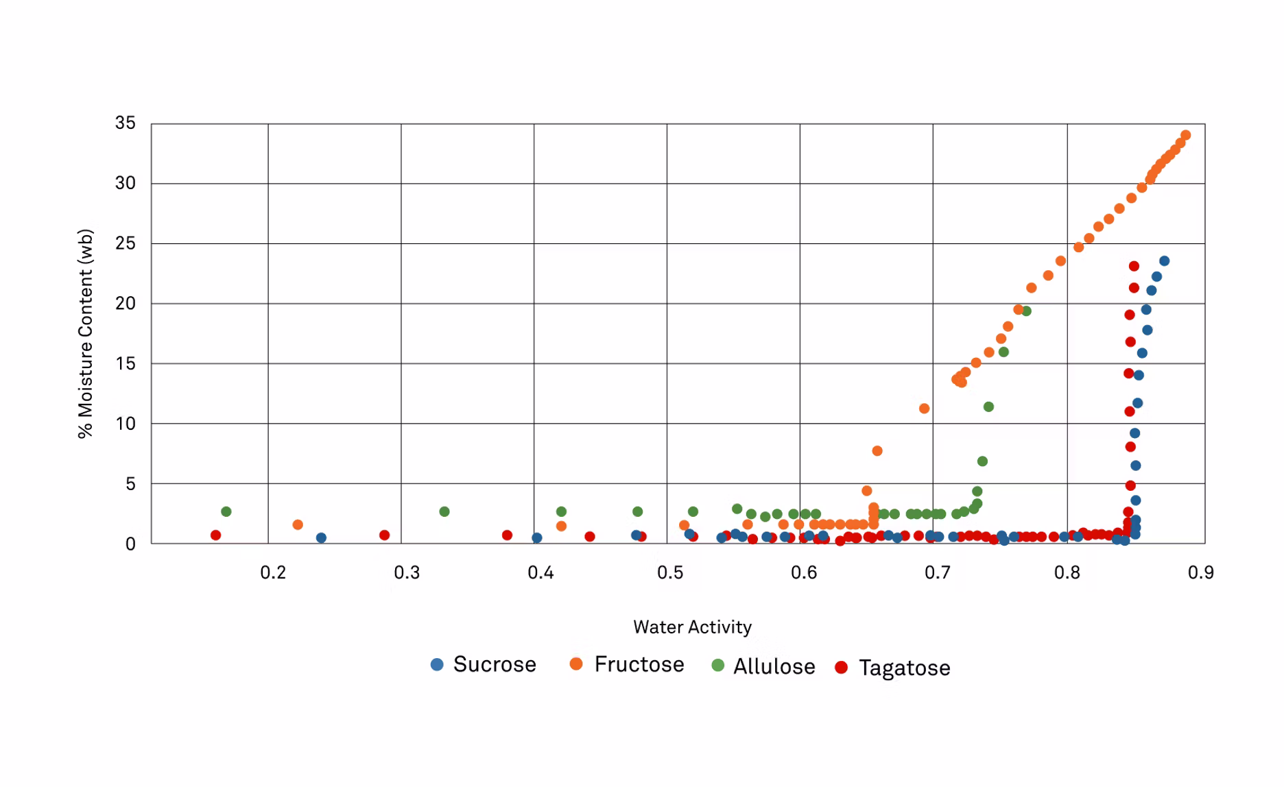 ZC: I maybe should have mentioned that these are absorption isotherms, so we're looking at the way that water is binding to these alternative sweeteners, and then we can really clearly see inflection points or deliquescence points where these are going into solution. Now, let's look at fructose and how it relates to a few others, so we'll be looking at fructose, allulose, as well as tagatose.