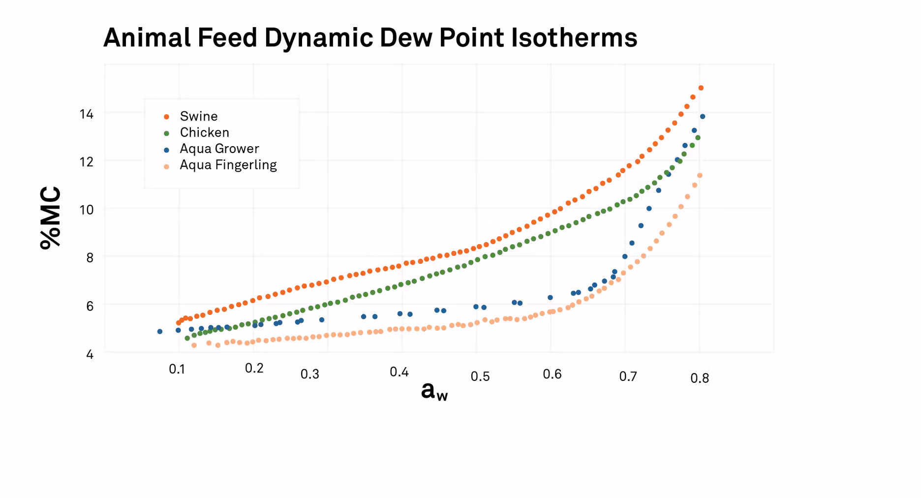 Our in-house examinations of animal feed confirmed that small changes in moisture content cause significant changes in water activity, making it essential to measure water activity to monitor and control moisture in animal feed. Creating isotherms allows feed processors and manufacturers to identify the ideal water activity range for their product, enabling significant optimization of production and increases in consistency, quality, and safety.